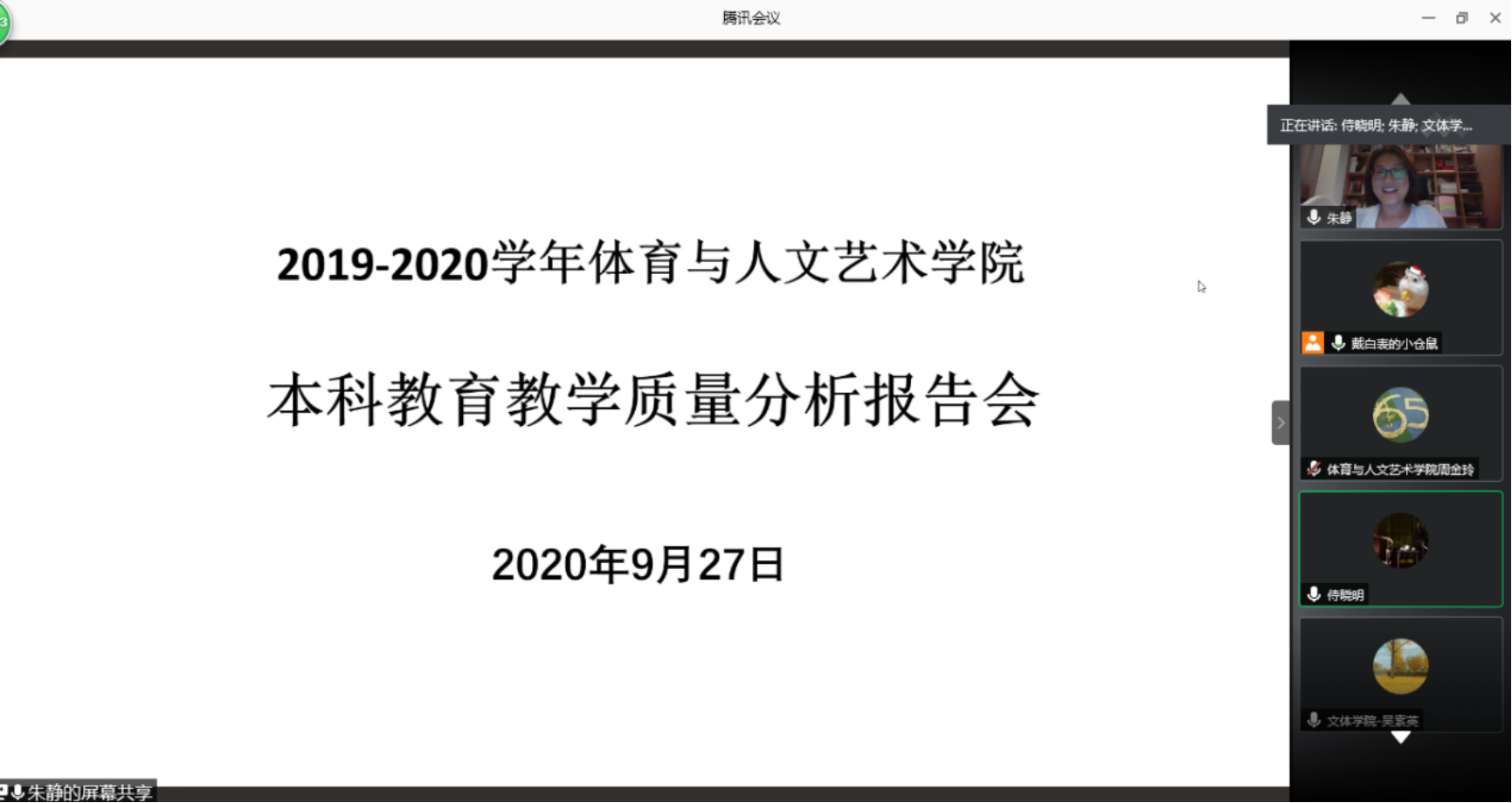 2020年9月27日,体育与人文艺术学院线上召开了2019-2020学年本科教学质量分析报告会,会议由学院教学副院长朱静主持,文体学院全体教职工参加了会议。