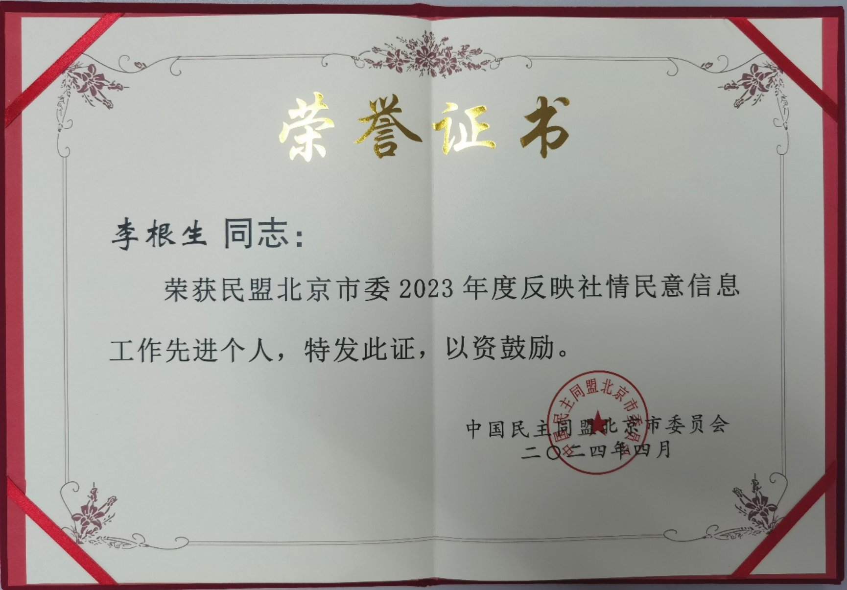 4月19日,民盟北京市委召开2024年参政议政工作会议。会议传达学习了民盟中央2024年参政议政工作会议精神,对民盟北京市委2023年参政议政调研工作和社情民意信息工作进行总结表彰。中石大民盟盟员李根生院士荣获“民盟北京市委2023年度反映社情民意信息工作先进个人”。