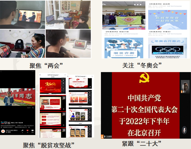计算机20-3团支部关注时事,定期学习党的理论知识。先后组织学习“脱贫攻坚战”“两会”“冬奥会”“建团百年讲话”“二十大”等热门时事,深入学习宣传贯彻习近平新时代中国特色社会主义思想,不断提高思想政治水平。并针对每个专题学习制作原创视频五篇,发布在公众号上,影响身边更多的同学提高思想政治水平。