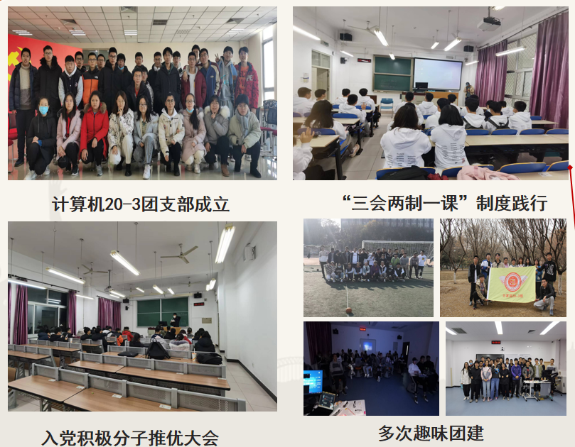 计算机20-3团支部成员积极向党团组织靠拢,自成立以来发展,有新团员2人,入党申请书提交率:100%此外,支部坚持“三会两制一课”制度。定期召开支委会、组织生活会。开展奥森公园团建、观看爱国电影、冬至联欢会、冬奥会宣讲、门球竞技赛等特色团建。