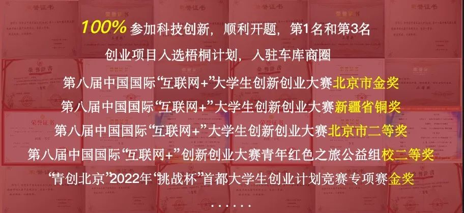团支部成员100%参与科技创新项目,于大学生创新训练项目中获得开题第2名和第6名;同时积极参与各类竞赛,荣获 第八届“互联网+”大学生创新创业大赛北京市金奖、新疆维吾尔自治区铜奖、北京市一等奖、二等奖等多级奖项,“青创北京”文化创意赛道金奖等二十余项荣誉。