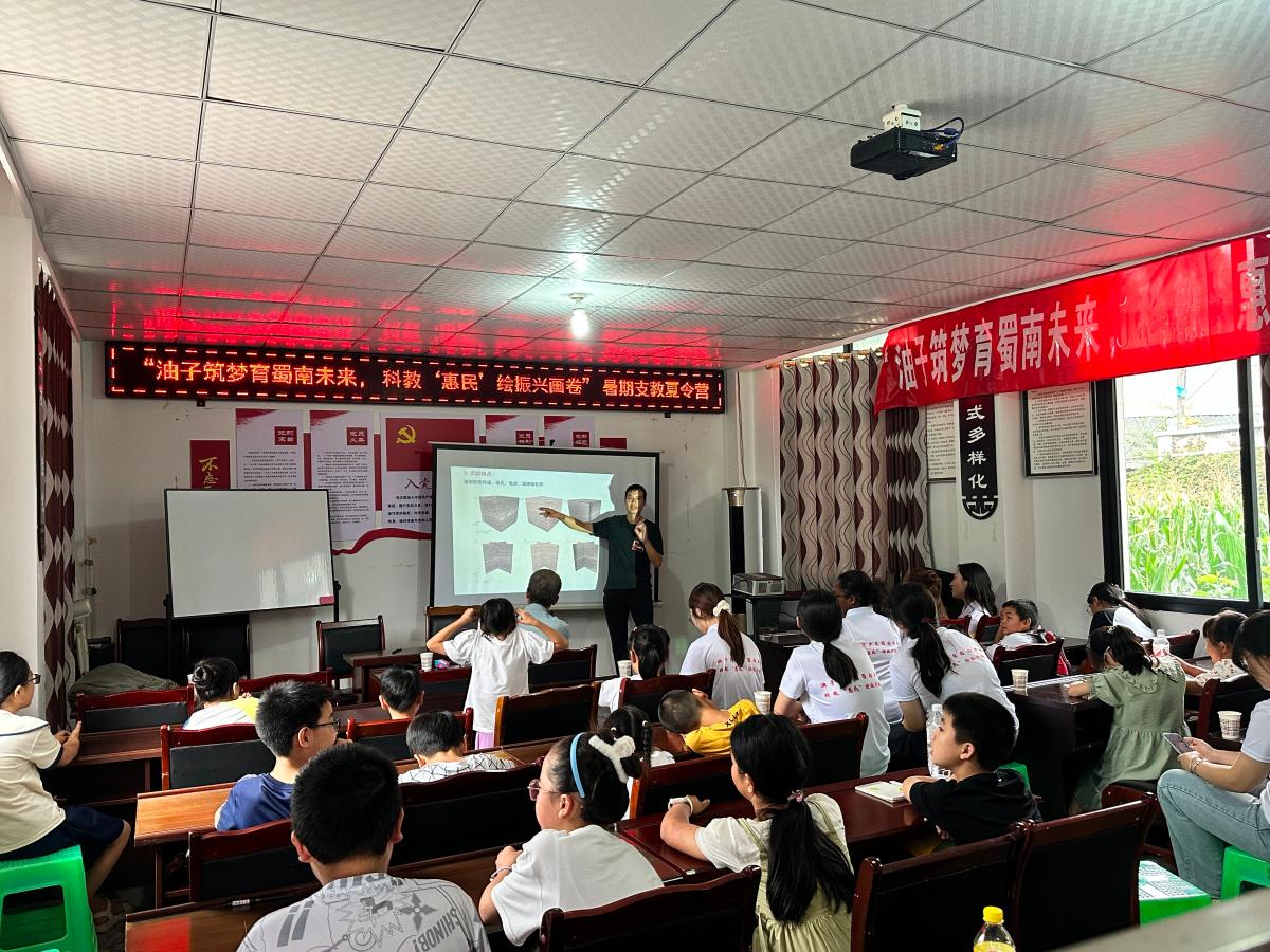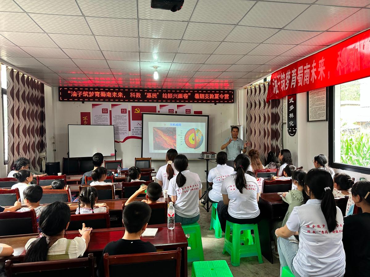 当日下午,“油子筑梦育蜀南未来,科教惠民绘振兴画卷”暑期支教夏令营开营仪式举行。学校师生、珙县底洞镇政府相关人员、惠民村34名学生参加仪式。中石大教授团队为惠民村的孩子们科普了地球科学相关知识,教授陈践发讲解了“石油的形成及其在日常生活中的用途”,副教授马勇介绍了珙县当地富存的“页岩及页岩气”相关知识,特邀教师高峰带来了一堂生动的陶笛音乐课。