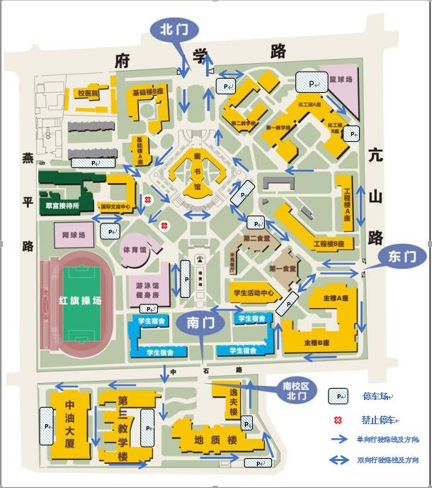 机动车进入南校园从西侧机动车入口驶入,车辆可停放在三教停车场和地质楼周边以及中油大厦周边停车区。