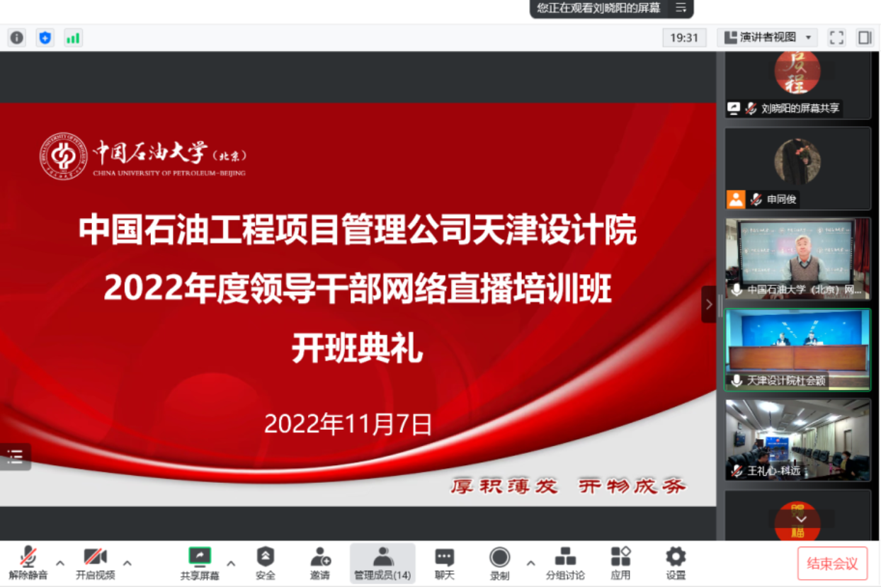 2022年11月7日,中国石油天然气管道工程有限公司天津分公司天津设计院2022年度领导干部网络直播培训班正式开班。院长陈桂刚、中国石油天然气管道工程有限公司天津分公司天津设计院院长、党委副书记姜为民出席开班典礼并讲话。
