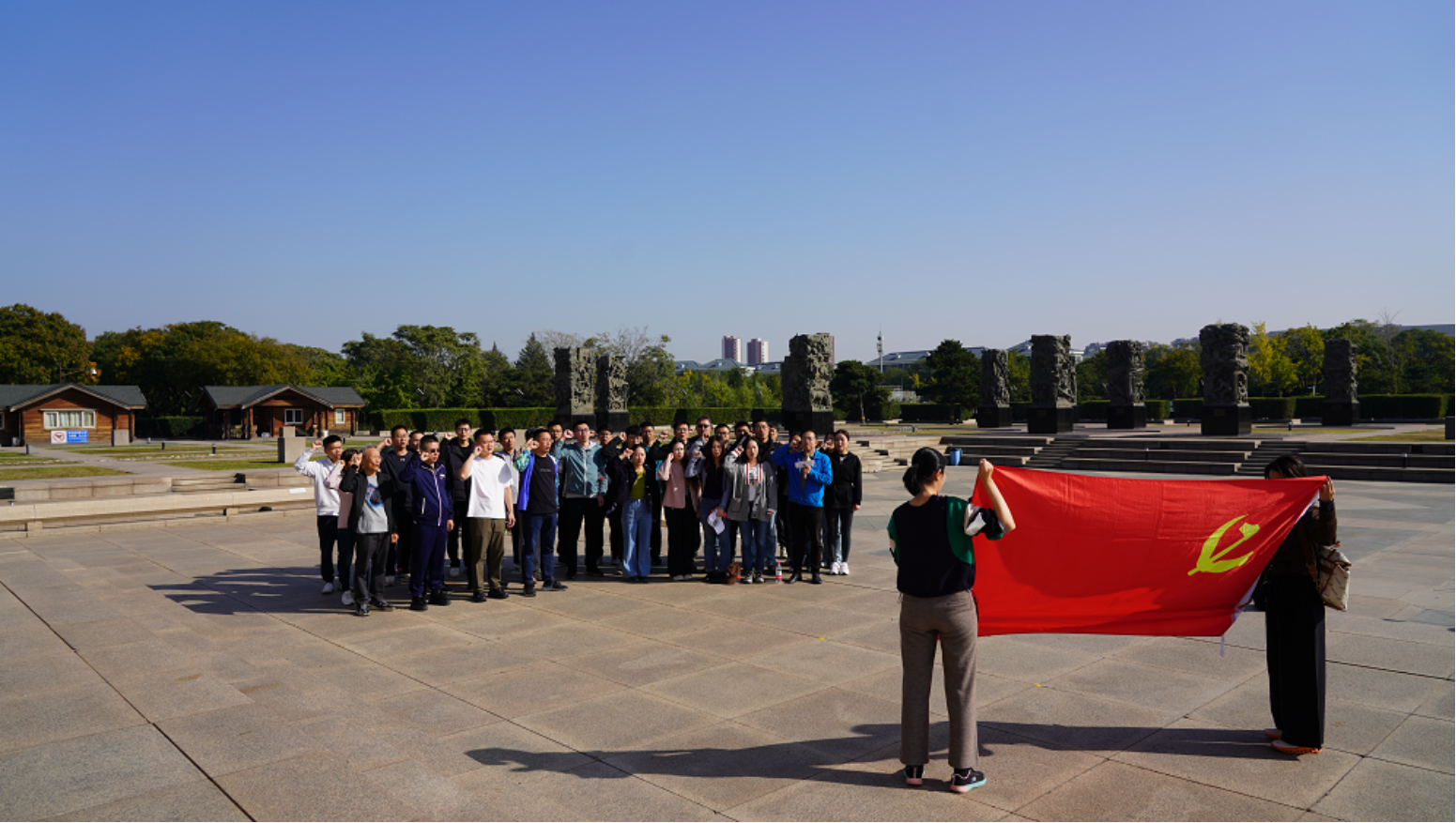 中国人民抗日战争纪念雕塑园共有日寇侵凌、奋起救亡、抗日烽火、正义必胜四个雕塑集群,讲解员声情并茂地讲述了中国人民可歌可泣的抗日事迹。园中下层广场中心的“中国人民抗日战争胜利纪念碑”高耸入云,庄严肃穆。同志们在纪念碑前肃立,面对党旗,在学院支部书记董刚的带领下,全体党员高举右手重温入党誓词,向在抗日战争中英勇牺牲的先烈致以最深切的敬意和怀念,同时也表达了新时代党员在新征程中勇挑重担,赓续红色基因,传承和弘扬党的光荣传统和优良作风的决心和信念。