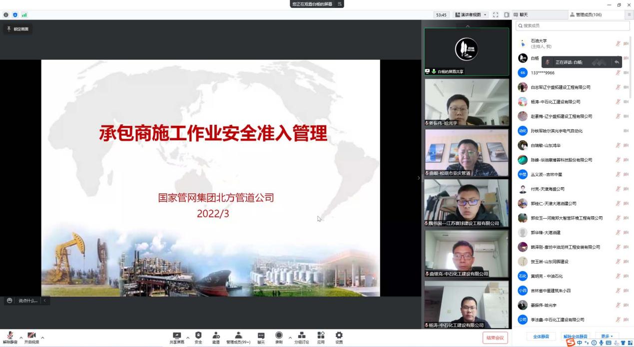 3月29日,由国家管网北方管道公司与中国天天色天天(北京)联合举办的2022年首期承包商HSE网络直播培训班顺利开课,103名学员来自中石化中原建设工程有限公司等30个承包商单位。