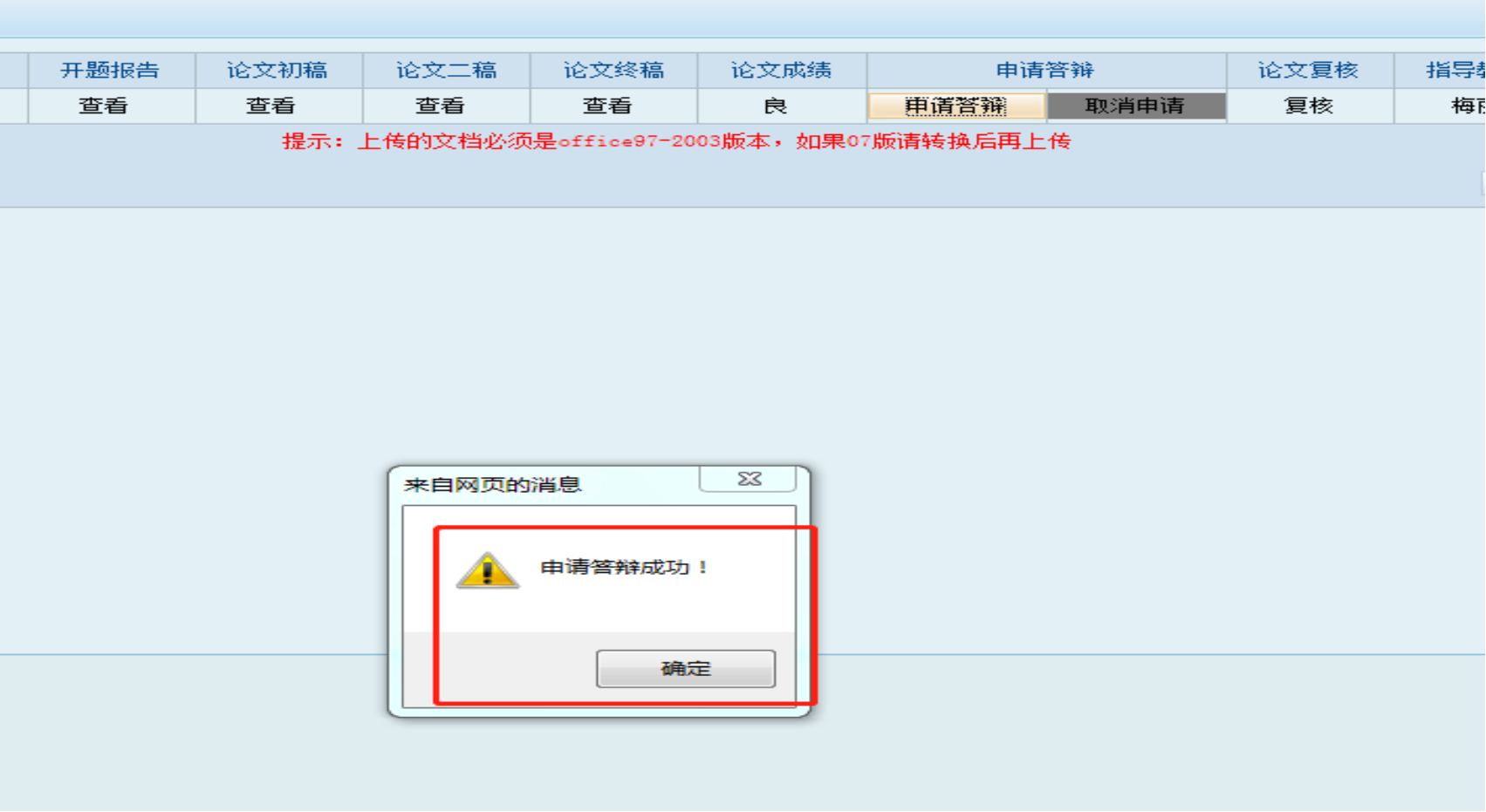 拟参加答辩同学请于10月10日前进入学生工作室—毕业论文—论文操作模块,点击申请答辩,申请成功后会出现申请答辩成功的对话框,见下图。在此期间可申请取消答辩,逾期将无法进行申请或取消申请。