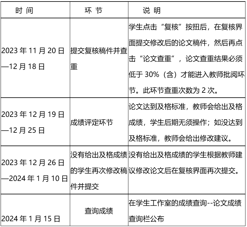 1. 2023年秋季及之前学期毕业论文成绩未及格的或超过两次未完成写作的在籍同学均需参加论文复核。