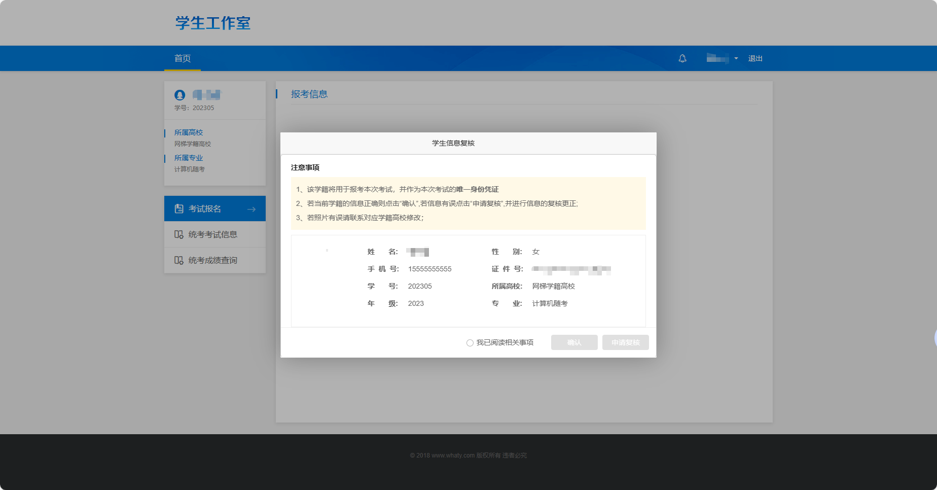 4.请认真核对报名系统中的个人信息、照片及对应的考试科目等,确保信息完整、正确,以免影响考试。提交信息后,立即刷新页面再次确认信息,如发现个人信息错误,请务必立即联系学习中心申请修改。考试期间无法修改个人的错误信息。