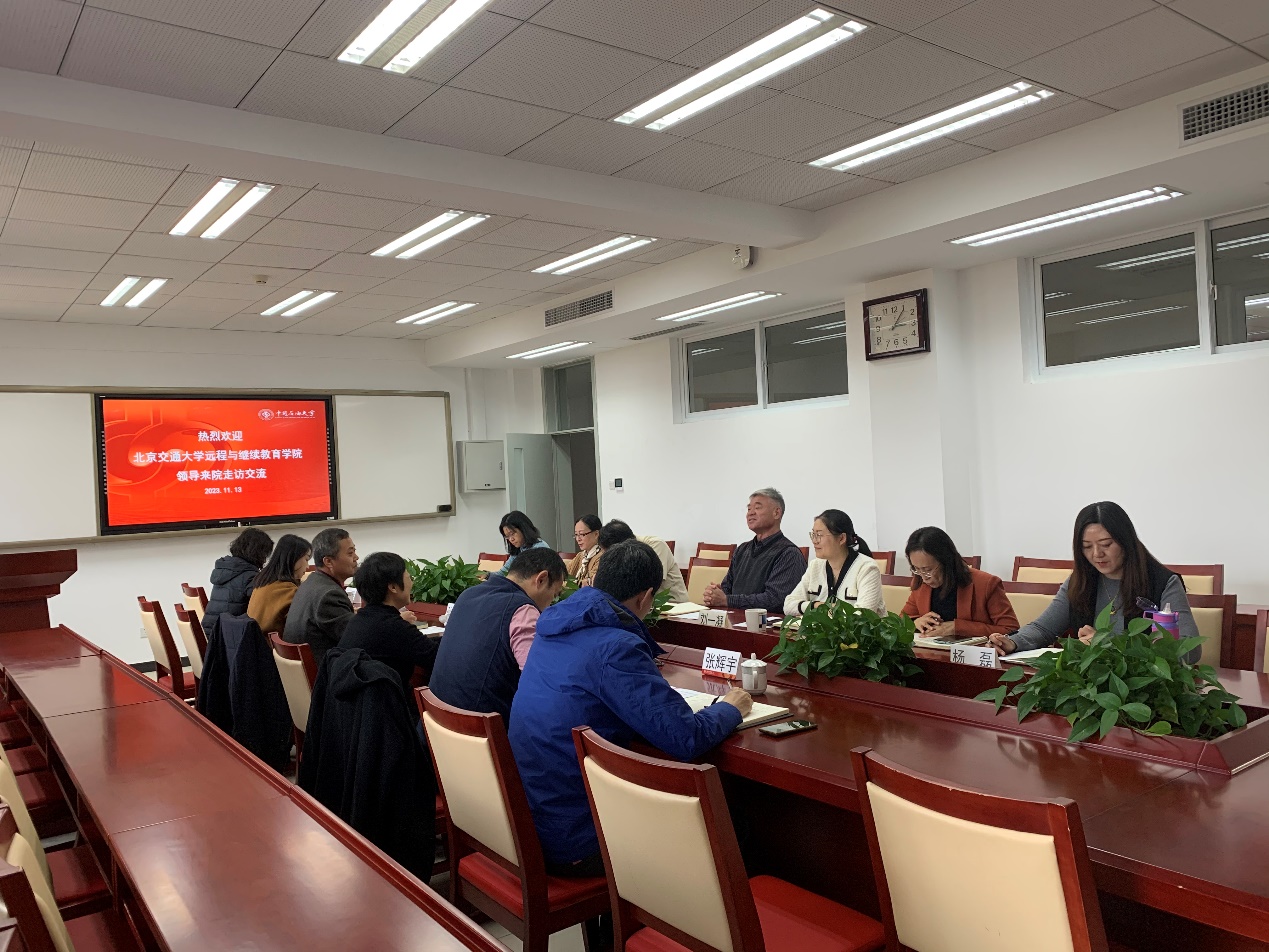2023年11月13日,北京交通大学远程与继续教育学院书记陈志新、院长孙长索、副院长李绍斌一行来我院走访交流,学院党总支书记、院长陈桂刚,副院长李水、刘一凝及学院相关工作人员与他们进行了交流。
