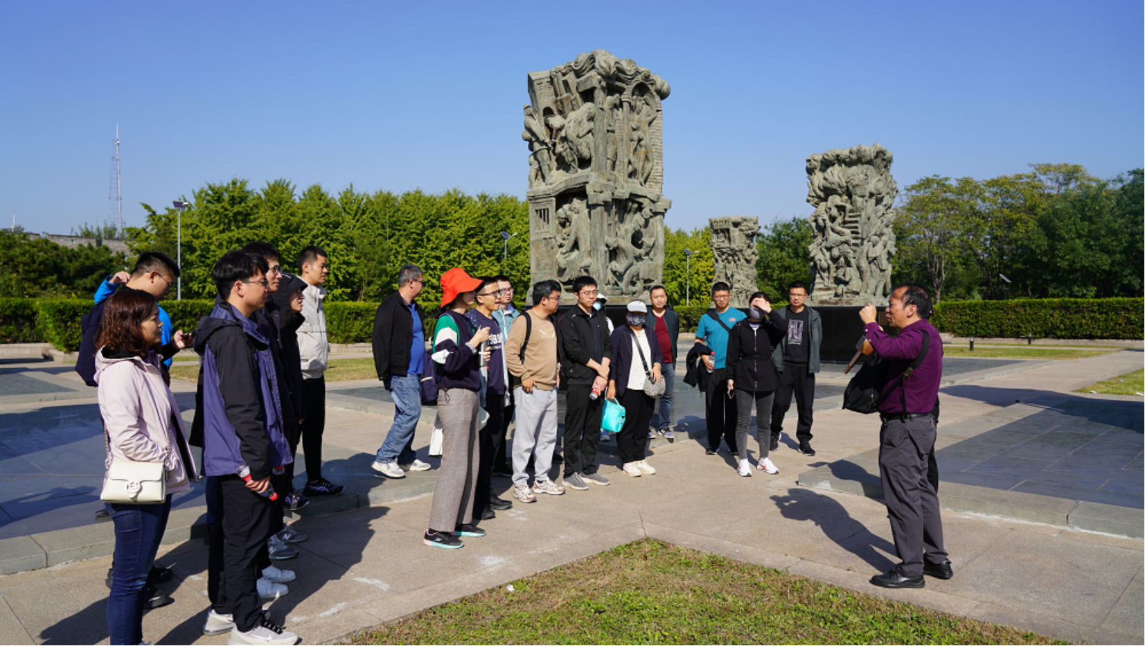 中国人民抗日战争纪念雕塑园共有日寇侵凌、奋起救亡、抗日烽火、正义必胜四个雕塑集群,讲解员声情并茂地讲述了中国人民可歌可泣的抗日事迹。园中下层广场中心的“中国人民抗日战争胜利纪念碑”高耸入云,庄严肃穆。同志们在纪念碑前肃立,面对党旗,在学院支部书记董刚的带领下,全体党员高举右手重温入党誓词,向在抗日战争中英勇牺牲的先烈致以最深切的敬意和怀念,同时也表达了新时代党员在新征程中勇挑重担,赓续红色基因,传承和弘扬党的光荣传统和优良作风的决心和信念。