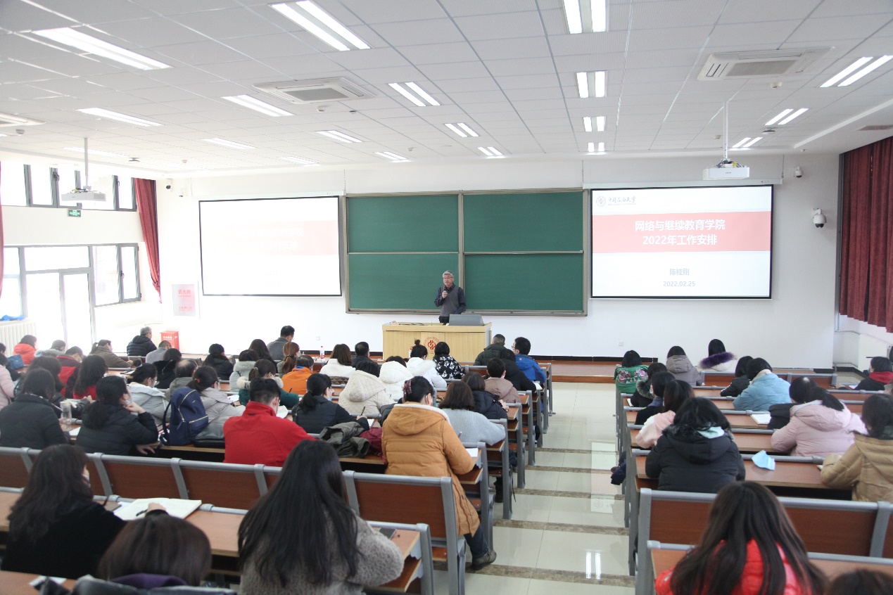 2022年2月25日,网络与继续教育学院在五教202教室召开了2022年工作部署会,学院全体教职工参加会议,院长陈桂刚作工作部署。
