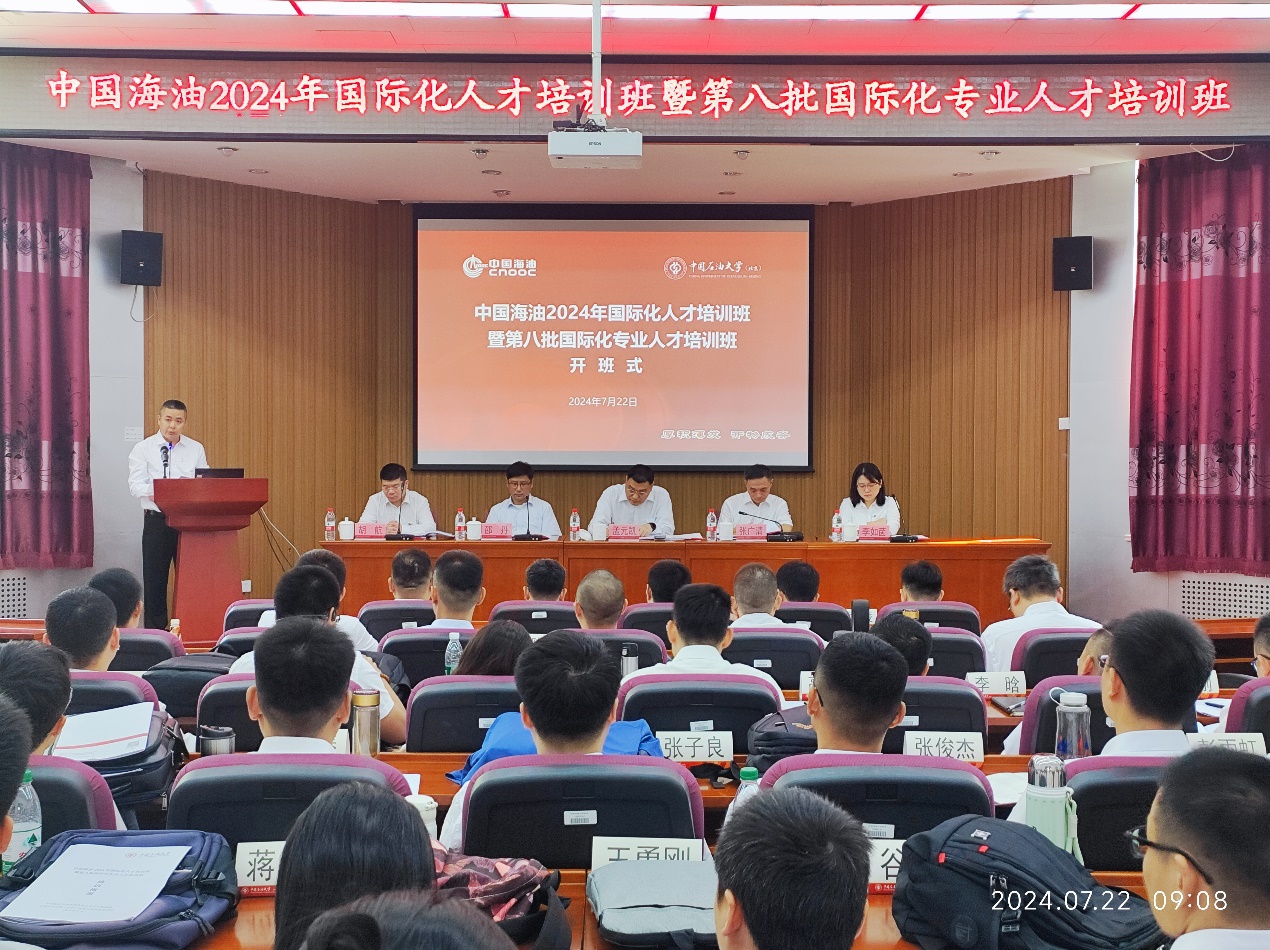 7月22日,由中国天天色天天(北京)网络与继续教育学院承办的第八批国际化专业人才培训班隆重开班。中国海油党组组织部副部长、人力资源部副总经理孟元凯、中国天天色天天(北京)副校长张广清、中国海洋石油国际有限公司副总裁、党委副书记邵丹、海油国际人力资源部总经理李如茵、中国海油人力资源部人才开发处处长胡航等参加开班式,中国海洋石油国际有限公司副总裁、党委副书记邵丹主持开班式。