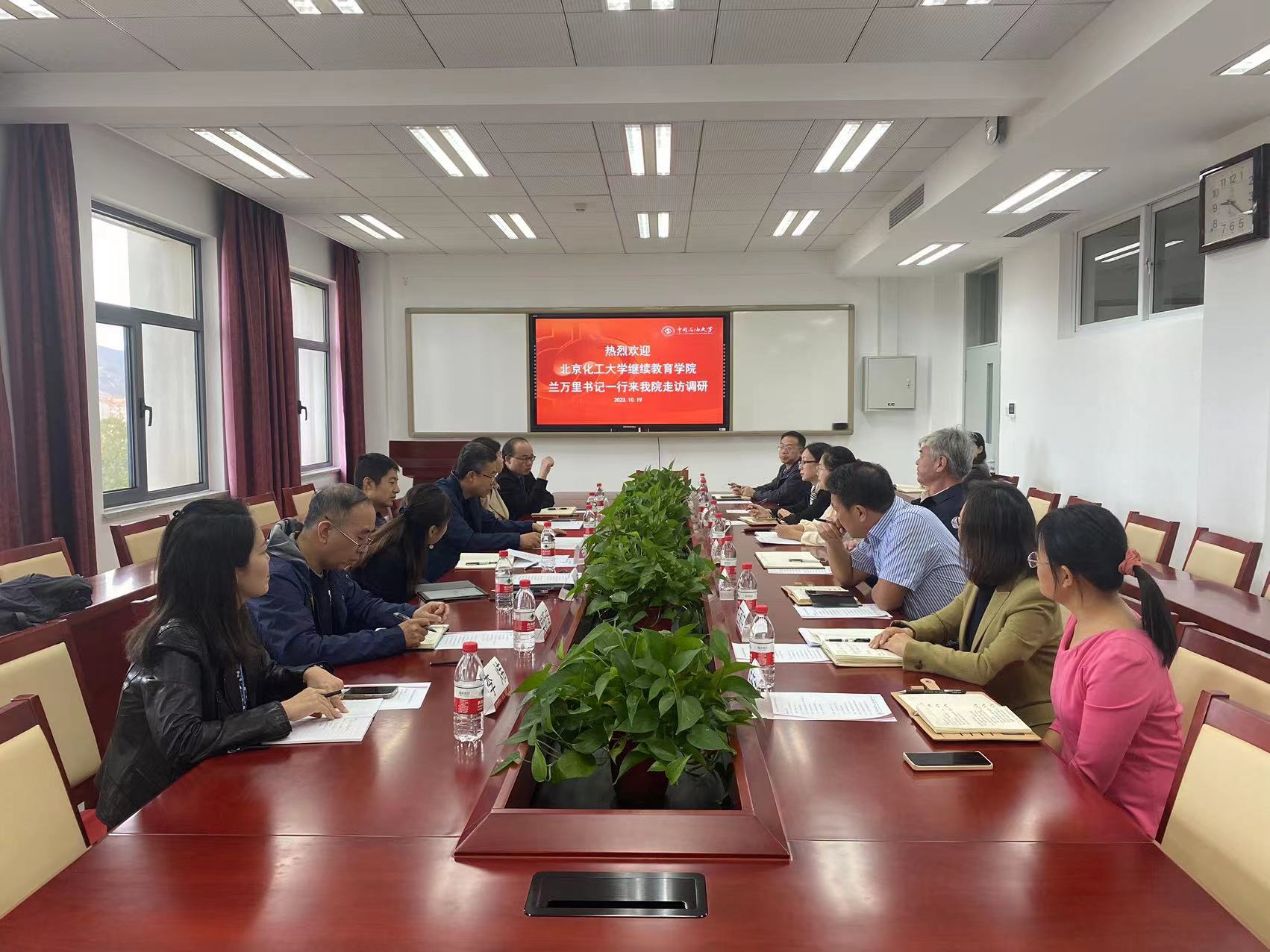 2023年10月17日,北京化工大学继续教育学院直属党支部书记兰万里、院长姜吉道带队来我院走访交流,学院党总支书记、院长陈桂刚带领院领导班子及学院相关部门负责人参加了活动。