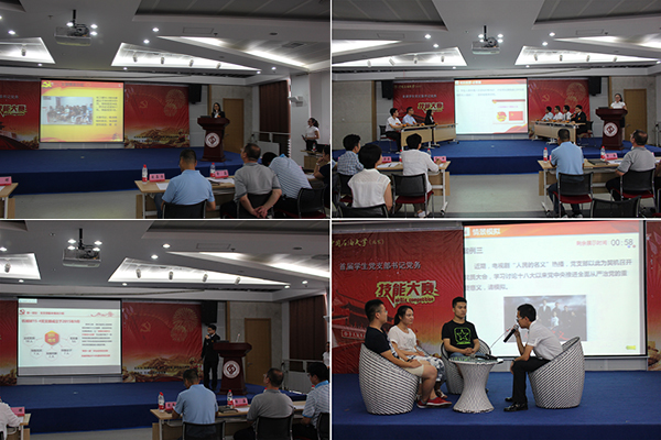 决赛从初赛选手中选拔出7位选手进行了现场比试,共分为党支部风采展示、知识竞答、情景模拟三个环节。党支部风采展示环节,学生党支部书记介绍了党支部建设中通过帮扶互助、社区志愿服务、学风建设等创新方法开展组织生活及取得的显著成效;知识竞答环节中,通过必答题和抢答题考察基层组织建设和党员发展等实操性工作的细节把握;情景模拟环节,参赛选手与主演嘉宾根据指定情景合作演绎5分钟,情景设置包含党员发展过程中发展对象的困惑、组织生活会筹备中遇到的困难等。各位选手结合自己的工作经验进行了精彩的讲演和风采展示,获得了现场评委的好评。